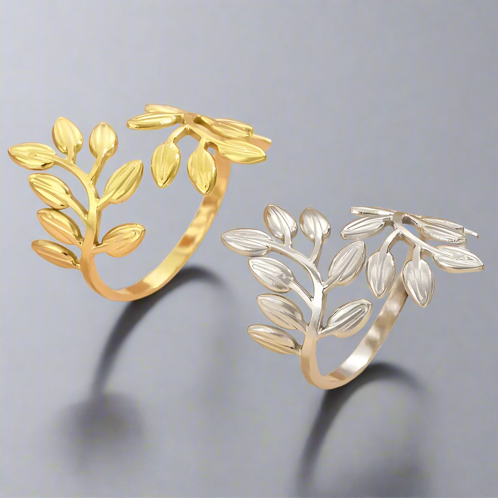 Deze verfijnde zilverkleurige en goudkleurige ring met een elegant bladmotief zijn een subtiele ode aan de natuur. Gemaakt van hoogwaardig roestvrij staal en afgewerkt met een luxe glans, zijn deze sieraden perfect voor een stijlvolle dagelijkse look of een sprankelende vakantiedag. De verstelbare pasvorm maakt het comfortabel én geschikt voor elke vinger.