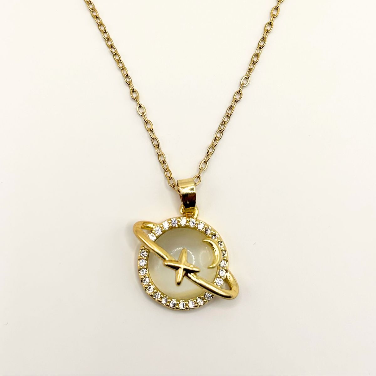 Deze goudkleurige ketting met ster, maan en planeet hanger is een echte eyecatcher voor wie van betoverende details houdt. De glinsterende strass-steentjes en het hemelse ontwerp geven jouw outfit een dromerige, kosmische flair β perfect voor feestjes, etentjes of een stijlvolle dagelijkse look.
