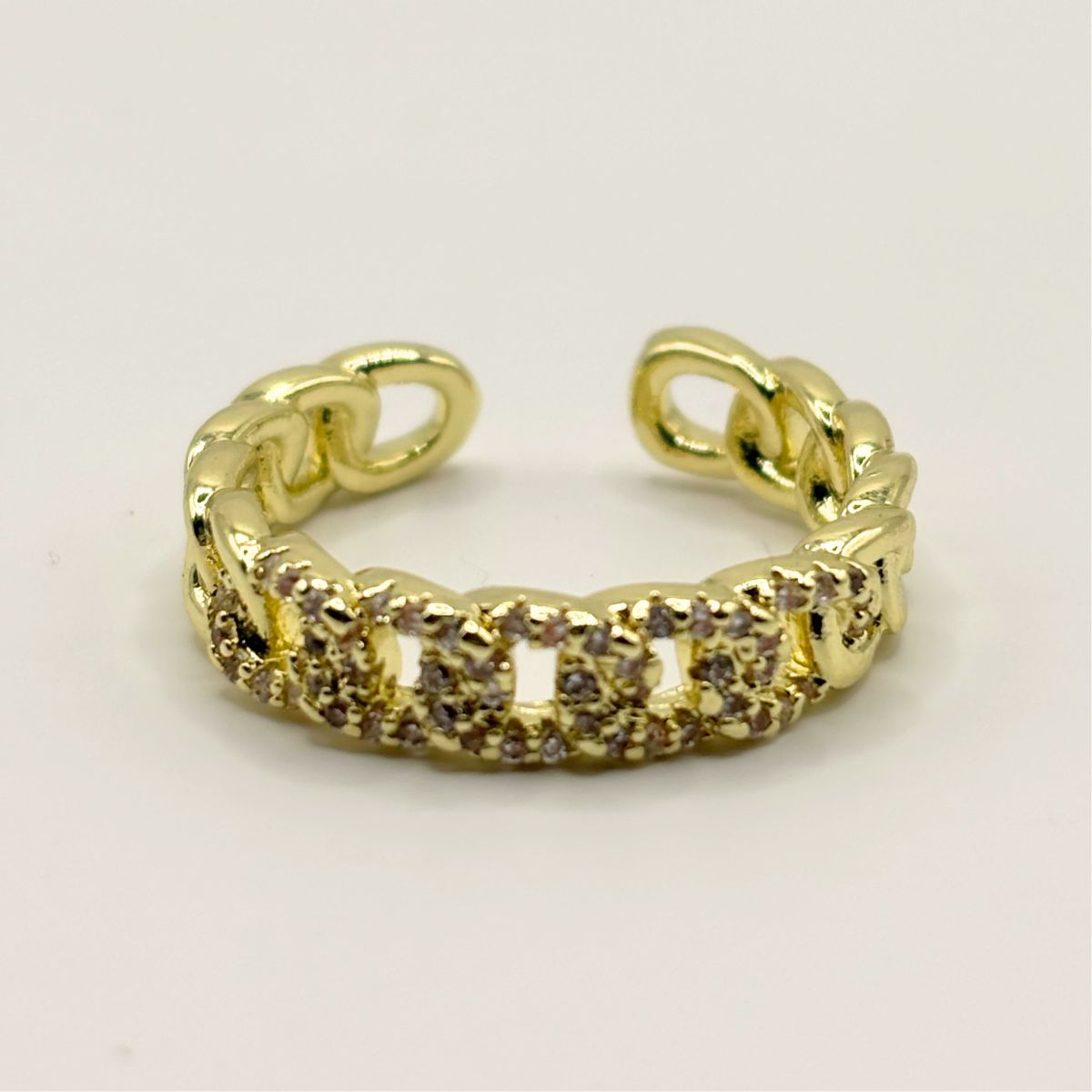 Deze elegante goudkleurige kettingring straalt luxe en eenvoud tegelijk uit. Het verfijnde schakelontwerp is versierd met glinsterende strass-steentjes, wat deze ring perfect maakt voor een avondje uit, een feestje of om elke dag een vleugje glamour toe te voegen. Dankzij het verstelbare design past hij comfortabel om elke vinger.